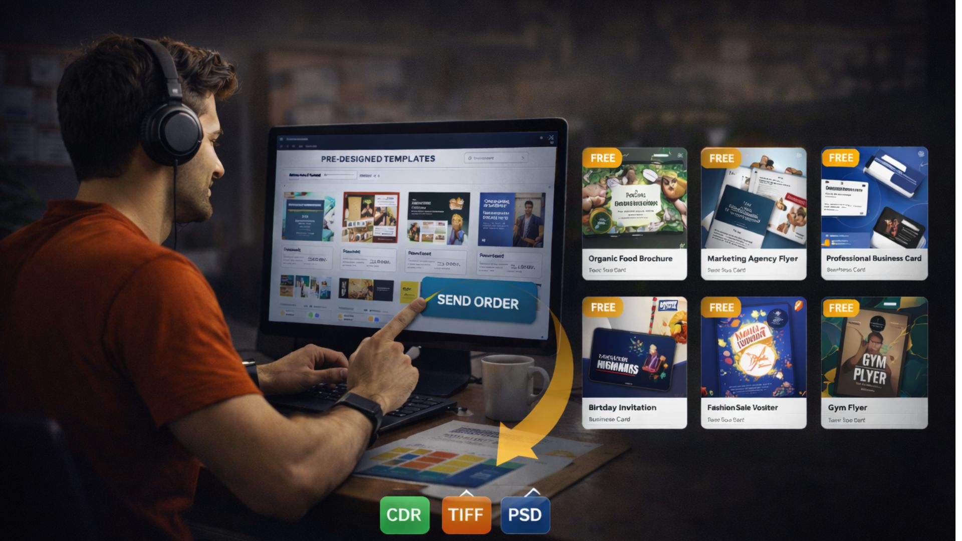 Designers can easily create printing orders by selecting category, size, quantity, and uploading design files such as CDR, PDF, TIFF, or JPG.